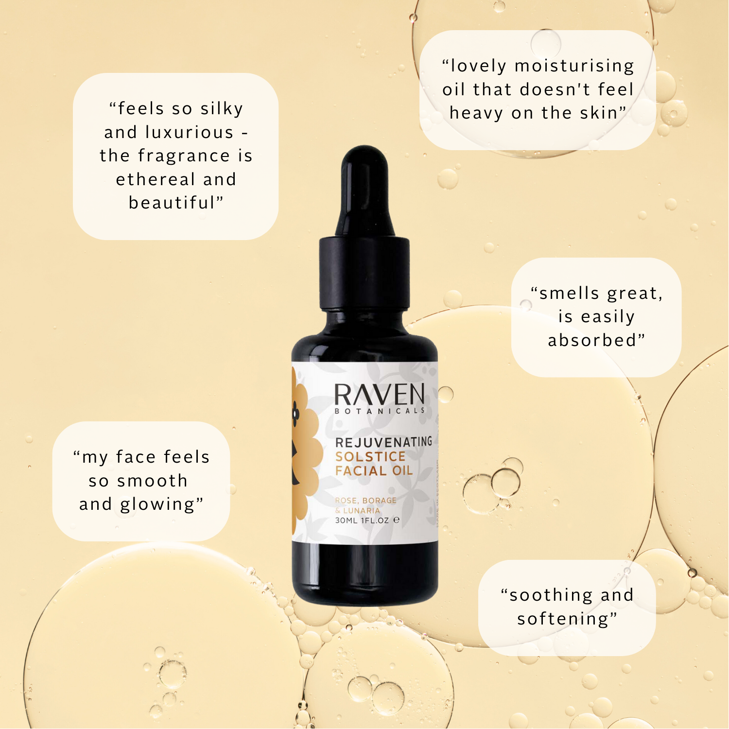 Solstice Rejuvenating Facial Oil Transform your skincare routine with our rejuvenating facial oil, crafted to visibly reduce fine lines and wrinkles. Formulated with potent botanical actives, it naturally stimulates collagen and elastin production, repairs imperfections, soothes redness, and prevents transepidermal moisture loss by sealing in hydration, leaving skin supple, balanced, and beautifully revitalised.