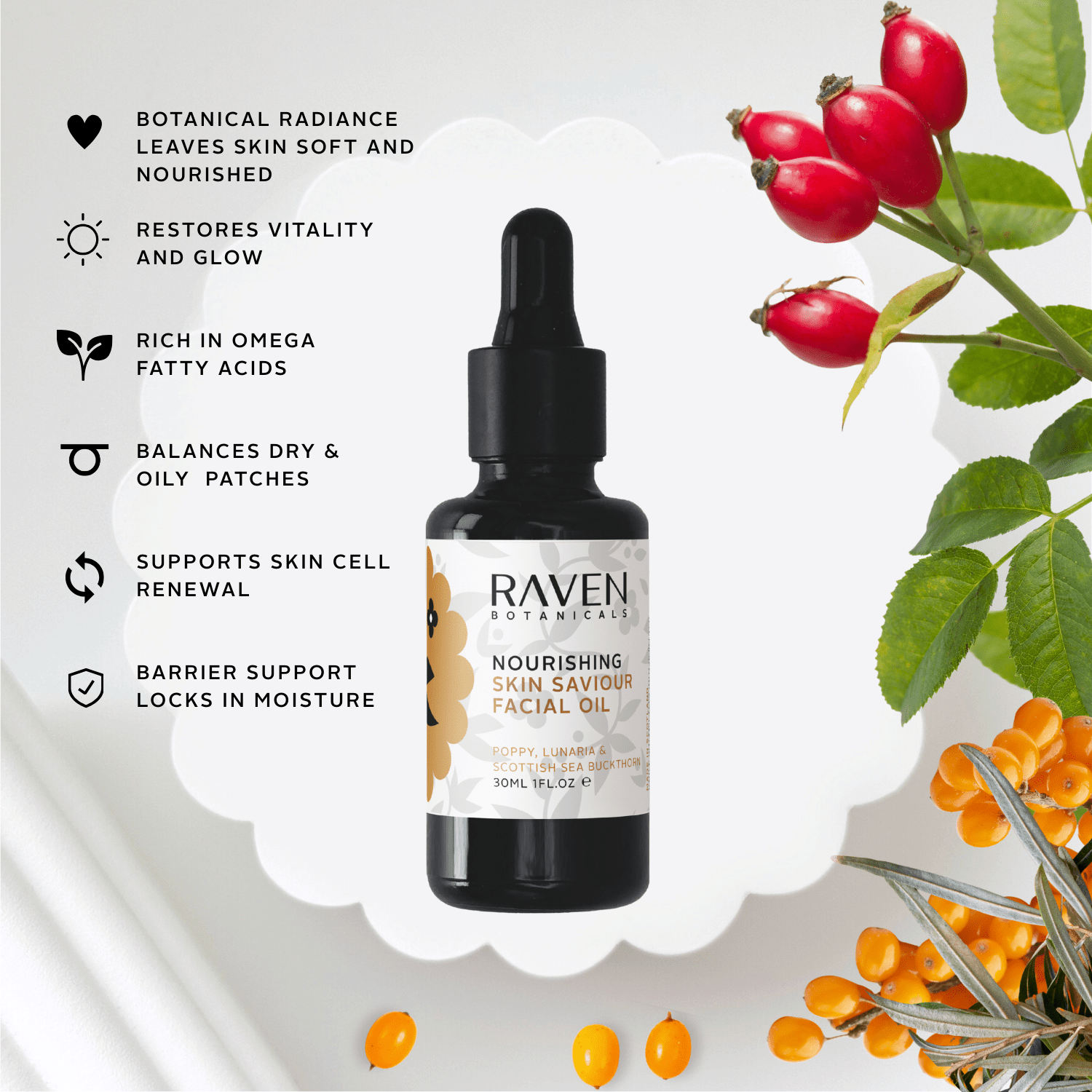 Skin Saviour Nourishing Facial Oil This vitamin-rich facial oil is intensely concentrated with bioactive compounds that nourish and bring balance to the skin. Packed with essential fatty acids and time-honoured phytonutrients, it helps to smooth, calm, and protect for a revitalised, even-toned glow.