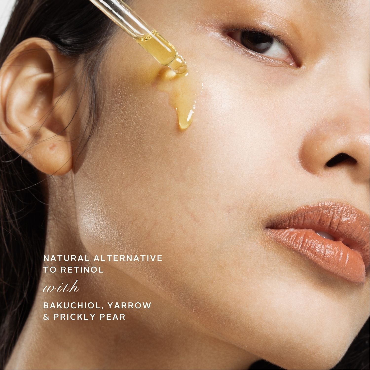 Rosa rubiginosa (Rosehip) seed oil, Simmondsia chinensis (Jojoba) seed oil, Corylus avellana (Hazelnut) seed oil, Euterpe oleracea (Acai berry) fruit oil, Opuntia ficus-indica (Prickly pear) seed oil, Citrus aurantium amara (Neroli) flower oil, Bakuchiol, Squalane (Olive-derived), Cannabis sativa (Hemp) seed oil, Boswellia sacra (Frankincense) oil, Lavandula angustifolia (Lavender) flower oil, Tocopherol (Vitamin E), Helianthus annuus (Sunflower) seed oil, Achillea millefolium (Yarrow) oil.