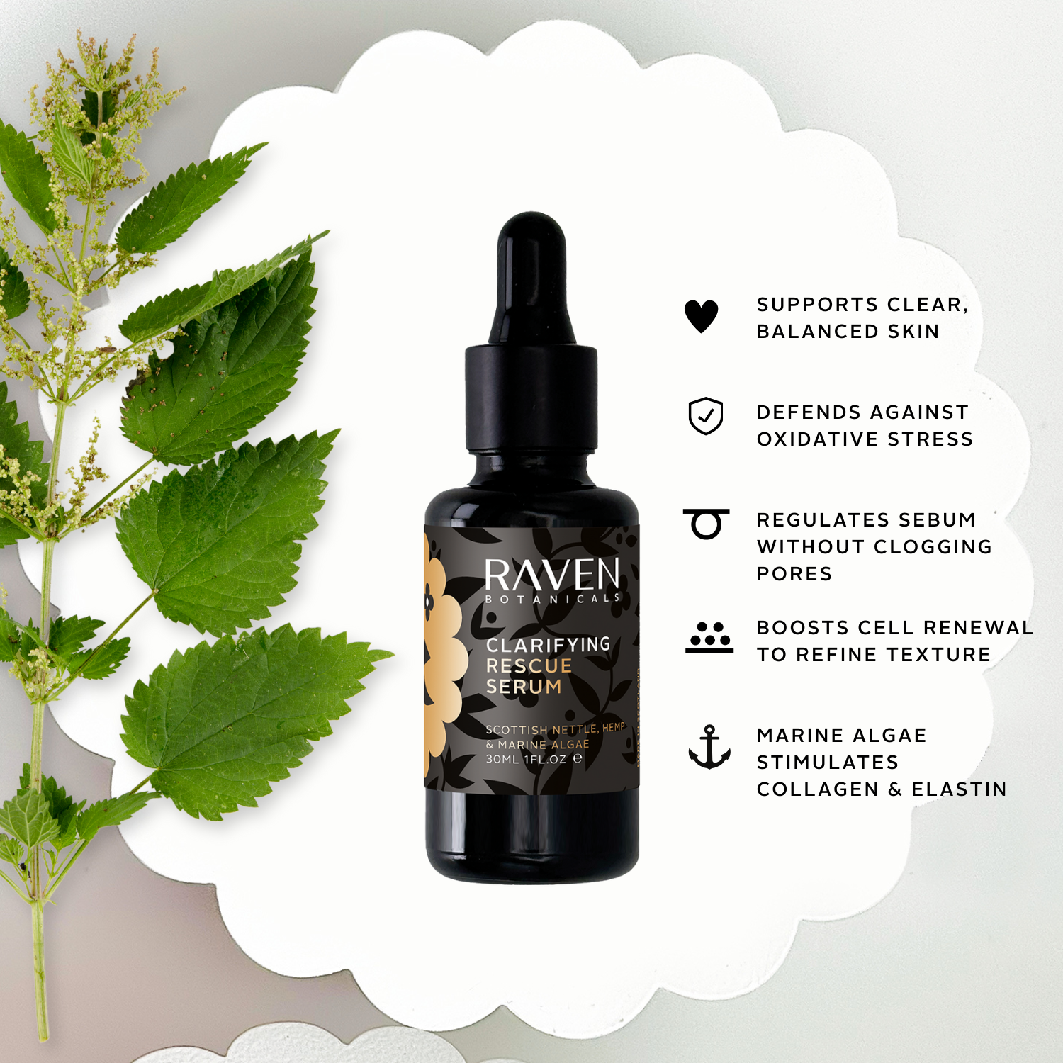 Rescue Serum Our collagen-boosting Rescue Serum, enriched with soothing natural ingredients such as nettle, hemp, and marine algae, enhances skin texture by visibly reducing scarring and calming irritation associated with acne, eczema, psoriasis, and rosacea. Naturally restorative, it soothes and prevents irritation, bringing comfort and clarity to your skincare routine.